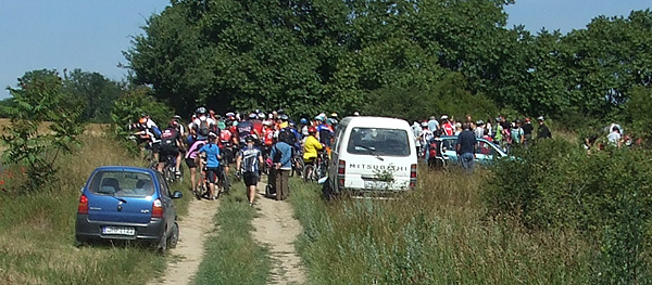 Épp egy öreg kövesúton hajtottam, amikor megláttam szembejönni két versenyzőt, akiknek a figyelmét valószínűleg elkerülte a fehér szalag, ami egy jobbra leágazó földutat jelzett.