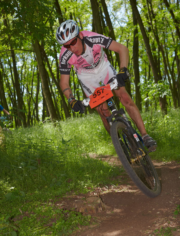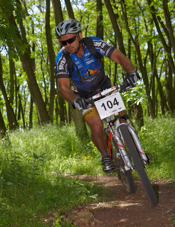 Később hátbaver minket a korábban említett két leányzó, tényleg komolyan veszik a versenyt és nem kis tempót diktálnak az emelkedőkön. Gondolok egyet, teszem rájuk a kereket, így könnyebb egy kicsit és hát aszfalton vagyunk, haladjunk, sok van még hátra. Terepre érve újabb mászás, Laci beragad, így meg tudok lépni. Mint később elmondta, később vissza is vett a tempóból. Néha-néha még összerezzenek, amikor nyikorgást hallok a hátam mögül, ugyanis Laci ismertetőjele a nyikorgó pedálja, de inkább előre figyelek, ha jön, akkor úgyis jön, ha látom, ha nem. Begyűjtök pár embert lefelé, többek között Perlaky Evelint is, aki kesőbb harmadik lett összetettben a lányoknál. Kezd kialakulni egy kisebb sor, legalább nem megyek egyedül. Szóba elegyedik velem az egyik sporttárs, kitárgyaljuk a technikát, míg a sorunkban lévő két leányzó meg lihegve egymást gyűri éppen, gondolom lehetett pár papírra nem illő gondolatuk, hogy mit beszélgetünk itt mindenféle hülyeségekről, amíg ők már levegőt is alig kapnak. :)