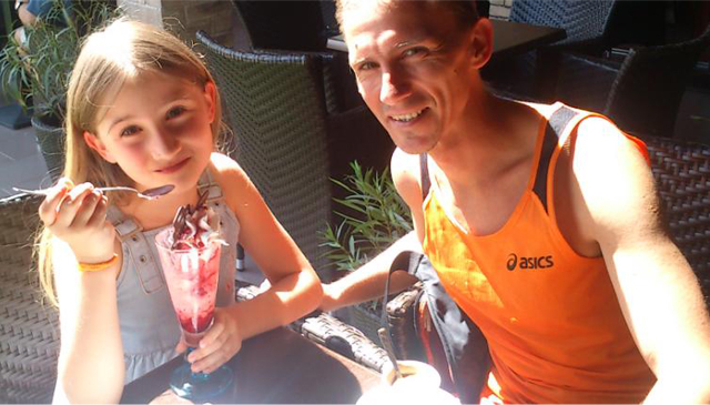 Az emelkedő tetején éreztem: "Innen már besiklok" (Bondor István pilóta a BB-n). Egy csinos hölgyet köröztem le a kis hídon, bíztattam, mire ő gratulált a harmadik helyemhez. Egy kicsit sikerült is gyorsulnom a végére, így 1:27:34-el estem be két fiatal atléta után a célba. Gyors frissítés, nem állhatok meg, mert kislányom és feleségem hat kilométerre innen ülnek egy cukrászdában, ahova az idei Anyák Napját szerveztük. Jól esett a fagyikehely, gyors búcsú, majd futás vissza a versenyre, ahol Karesz (1:59) és a babgulyás már vártak.