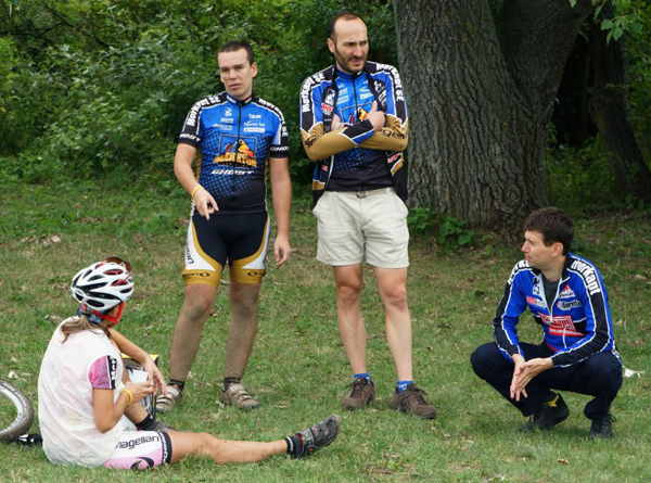 Kicsit nehezen találtam meg a helyszínt, de a szokásos, kövessünk bringával pakolt autókat módszerrel végül meglett a versenyközpont. Először Szóriba és Danó Petibe botlottam, akik rögtön el is zavartak nevezni, hogy ne játszam itt a nagyhalált, tudják, hogy szeretek dagonyázni, majd Pásztor Laci kocsijánál már csapaton belül ment a diskurzus, hogy ki indul, ki nem, van-e sár? Azzal sikerült meggyőznie, hogy ha nagyon sár van, akkor kiállunk az első, kisebb kör végén. Gaál Tomi már nem volt ennyire lelkes, közölte, hogy ő ugyan el nem indul és Oszi is hazaugrott a futócipőjéért és inkább a 10 km-s futóversenyen indult. Így maradtunk öten, illetve hatan a társaságból: Jucus, Imre Szabi, Ondok Laci (jó volt újra találkozni vele, de a 24 óráson való indulásra rögtön nemet mondott, majd végighallgatva az érveimet, megismételte.:D), Pásztor Laci és kisfia (ő az a bizonyos +1, lassan már csapattagnak számít, annyi gyerekversenyen indul :)), valamint én.