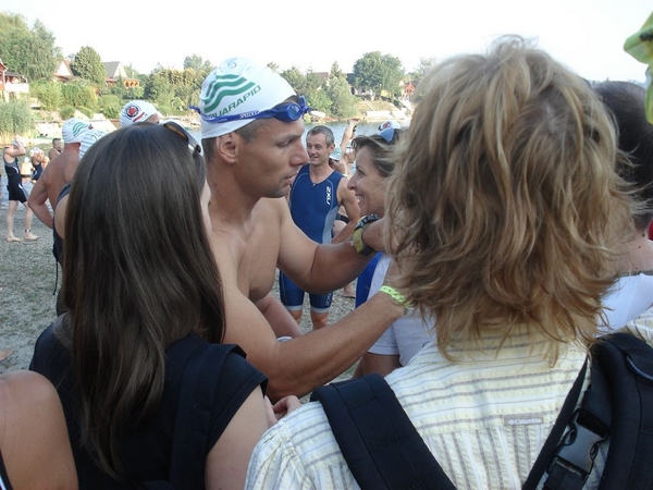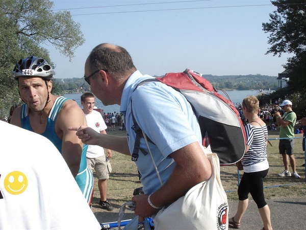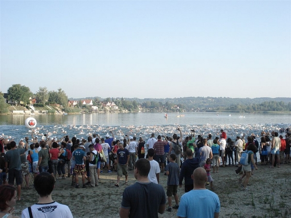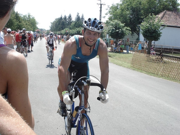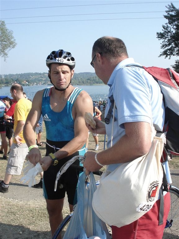 Nem tudtam, mennyire erős a triatlon mezőny úszásban, nem szerettem volna fölöslegesen tülekedni ezért a mezőny hátsó részén helyezkedtem el az indulást megelőzően. 7:25-kor pontosan eldördült a rajtjel és mindenki nekiiramodott a 3,8 km-es távnak. Két kört kellett megtenni a tavon. Nagyon kellemes volt a vízhőmérséklet, jól esett és jól is ment az úszás. Csak érdekességképpen jegyzem meg, hogy egy hónapja úsztam 1000 métert a Velencei tavon a kibójázott kajak-kenu pályán. Ellőtte már vagy 4 éve nem úsztam. Ennyi volt a fölkészülésem bár igaz, hogy nem számítok rossz úszónak. Az első körben 34 perc körül mentem, a végén 1:09 lett az időeredményem. Ezzel a mezőny első feléhez tartoztam.