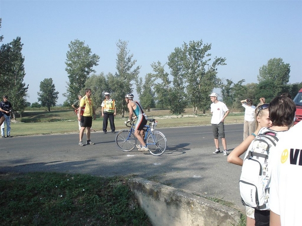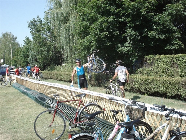 Élvezettel szálltam ki a vízből és gyorsan megkerestem a depóban a kerékpáromat. Valamiért a bicajomnál hagytam a váltócuccaimat nem pedig a közös helyen ahol rajtszámnak megfelelően voltak sorrendbe rendezve. Mindenképpen át kellett cserélnem a fürdőnadrágomat, nehogy kicsípje a bőrömet. Szükség törvényt bont elvet követve feltűnés nélkül toltam le a vizes gatyómat, és vettem föl a száraz alsónadrágomat ott a nyílt depóban. Magamra öltöttem a többi ruhadarabomat, cipőmet és már indultam is a 180 km megtételére.