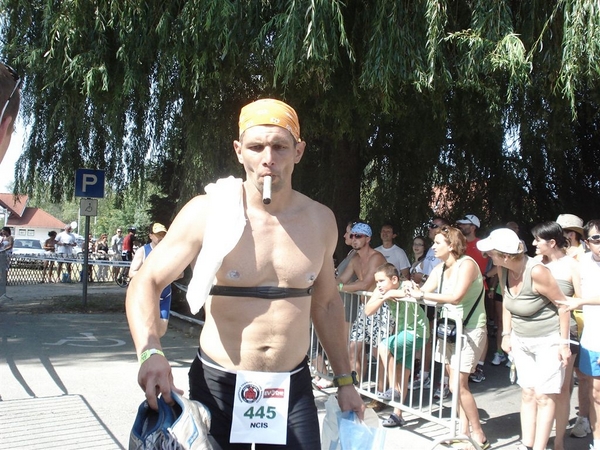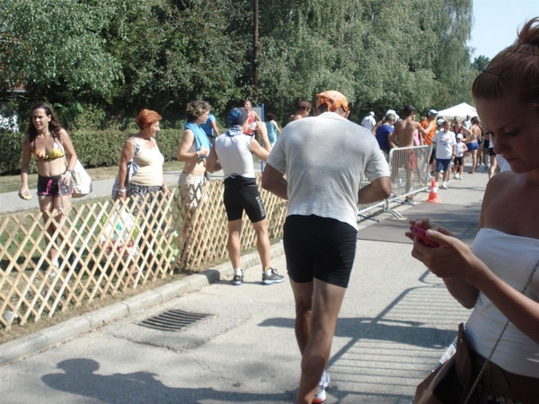 Itt azért már érezhető volt, hogy fáradtabb vagyok, mint az úszás után voltam. Optimista énemből fakadóan azt feltételeztem, hogy el fog múlni a kerékpározás okozta fáradtság, csak át kell állni izmaimnak a kerékpárról futásra. Ennek az érzésnek az eljövetelét egészen a negyedik körig vártam aztán beláttam, hogy ez már túlmutat a nagy falon, amelyet át kellene törnöm és inkább a túlélésre kezdtem berendezkedni. Nagyon távolinak tűnt a 42. km elérése. Türelmesen róttam a köröket, többször bele kellett sétálnom, minden frissítő állomást kihasználtam, leöntöttem a fejem vízzel, ittam, ettem egyszóval próbáltam töltődni.