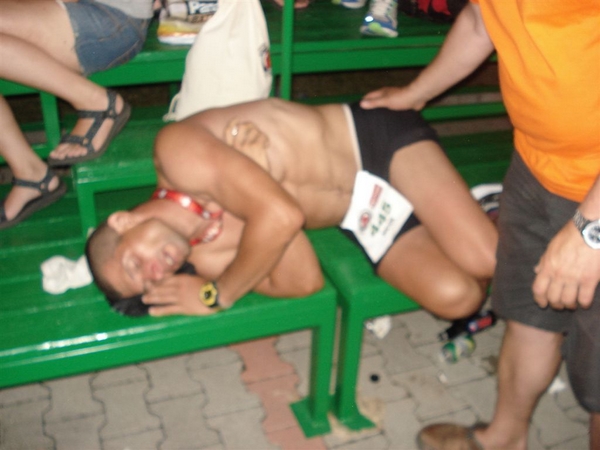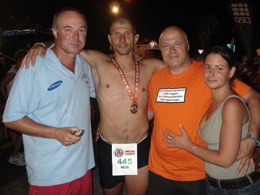 A padon fekve kb 45 percig agonizáltam, közben jött két görcs a jobb vádlimba, amelyeket sikeresen kilazítottam. Egyszer csak éreztem, hogy új energiák szabadulnak föl a pizza és a pihenés hatására, kezd visszajönni a mozgáskedvem. Tényleg bámulatos, hogy az emberi szervezet milyen gyorsan képes regenerálódni, újratöltődni és, hogy mennyi energia van fölhalmozva bennünk. Közben jött Csaba, keresett, mert nem értem oda a fordulóhoz ahol minden kör kezdeténél találkoztunk. Kiáltottam, hogy itt vagyok, megörültünk egymásnak és már mentünk is együtt kocogva tovább. Az utolsó kör már nem jelentett problémát (de a biztonság kedvéért Csaba velem tartott) és 15 óra 16 perc alatt végül sikerült teljesítenem a távot. A célba érkezés pillanatában igazi ironman lettem.