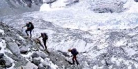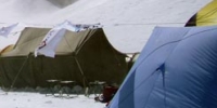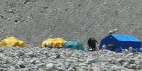 A vidék mostoha, zord, jeges-sziklás. Egy oldalmorénán kerültek kialakításra a sátorhelyek - mindhárom fiúnak saját sátra van. Már felállították az ebédlő- és a konyhasátrat is. | | :: 2007. 04. 14. Az Előretolt Alaptábor elérése