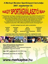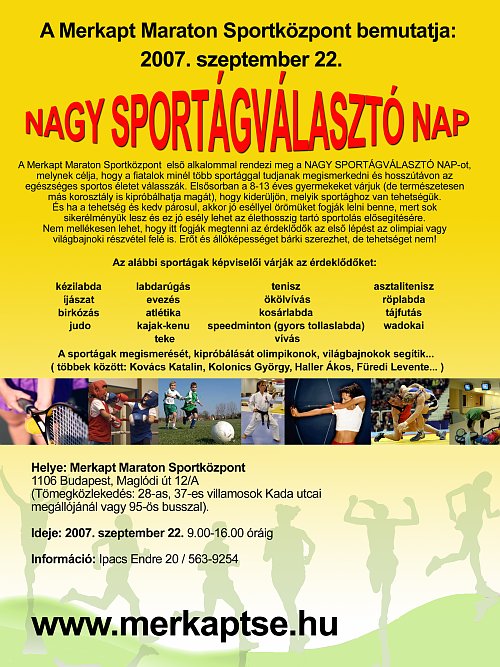2007. szeptember 22-én első alkalommal került megrendezésre a Merkapt Maraton Sportközpontban a Nagy Sportágválasztó Nap, amelynek célja az volt, hogy a résztvevő gyermekek minél több sportággal ismerkedjenek meg, az eseményen résztvevő szakemberek segítségével. A ragyogó időben több száz gyermek próbálhatta ki a jelenlévő, több mint 20 sportág egyikét. Igyekeztünk rendezvényünket színesebbé és vonzóbbá tenni élsportolóink meghívásával, akik örömmel tettek eleget felkérésünknek. A jelenlévő sportolók (Kovács Katalin, Pádár Ildikó, Füredi Levente, Haller Ákos, Kolonics György, Zsivótzky Attila) saját tapasztalataikkal és jó tanácsokkal segítették a gyerkőcöket.