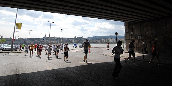 Az első 1 km 3’40”-re sikerült, ám éreztem, hogy ezt végig nem fogom tudni tartani, így egy kicsit visszaálltam. Megint az első női futók között találtam magam, ez az iram teljesen megfelelő volt. A verseny 70%-ban a pesti alsó rakparton zajlott, ezért a dunai szellő hűsítően hatott a száraz melegben. Dél felé enyhe pofaszelünk volt, de nem zavaró erősségű. A 6 km-es fordítóig egyenletes 4 perces átlagot tartottam, az időm féltávnál 23’40” volt.