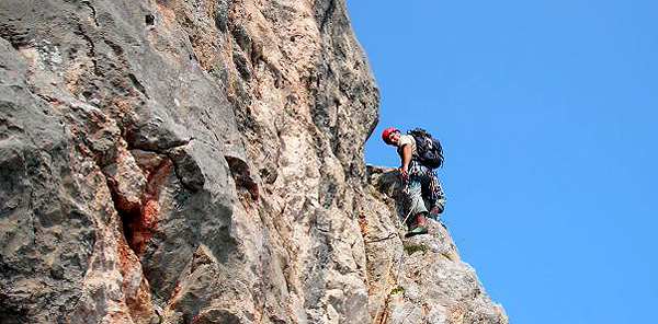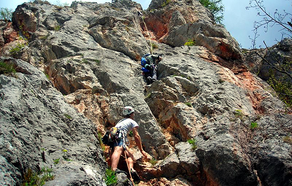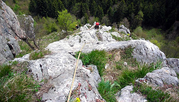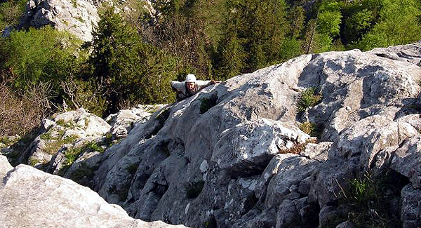 Másnap Tamásék ajánlottak két utat. Az első rögtön meglepetést tartogatott, mivel a második kötélhossz egy szűk barlangban vezetett. Ezt azonnal átengedtem Nojának. Semmi kedvem nem volt előrehernyózni egy sötét lyukban a magam két méterével. Így enyém lett a kezdő hossz. Teleaggattam magam és elindultam. Meglepően könnyedén lépkedve fel egy ferde repedés mentén. Noja következett. Elhaladt mellettem, majd eltűnt a függőleges lyukban. Kezdetben lassan, araszolva haladt a kötél a kezemben. Közben bosszús hangok jöttek felülről. Kis idő múlva „stand kivehetsz!”. Elindultam. Tétován lépéseket keresve a csupasz falon, préseltem be magam a hűvös résbe, hátamon a zsákkal. A felénél, persze ahogy számoltam, beszorultam. Szánalmasan próbáltam lépést találni a sima falú hasadékban, közben pedig hangosan átkokat szórtam. Végül nagy nehezen felküzdöttem magam és megkönnyebbülten kiléptem egy napsütötte párkányra. Az út további részén végig a barlangi élményekről beszélgettünk Nojával.